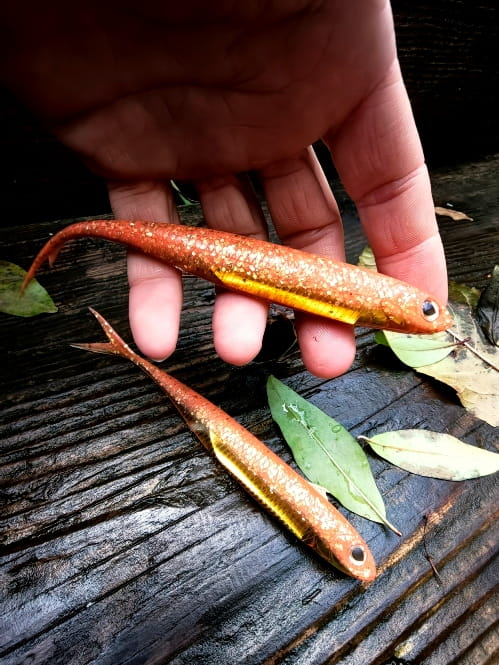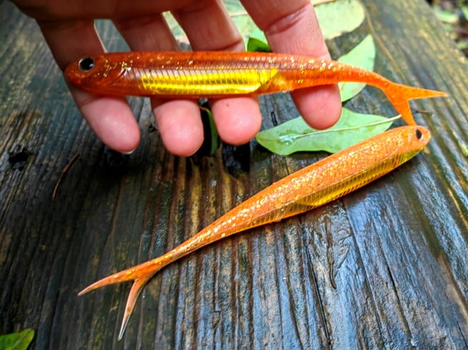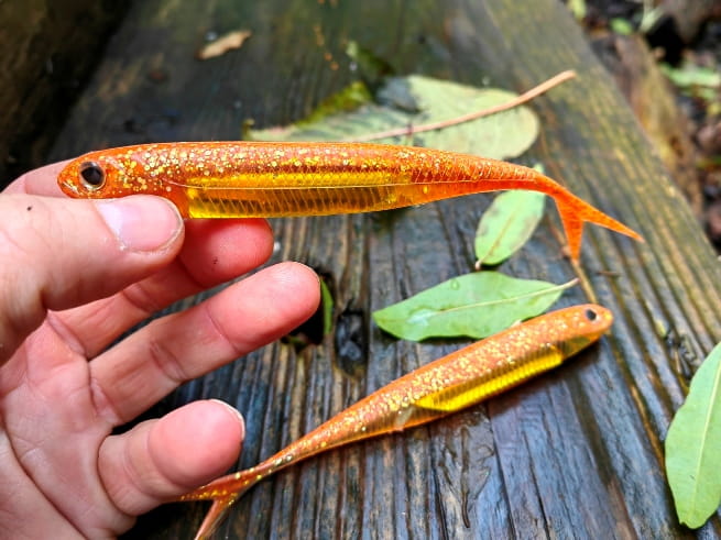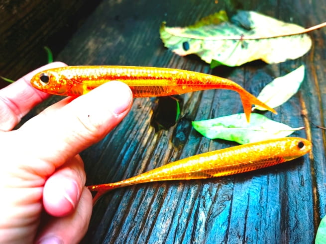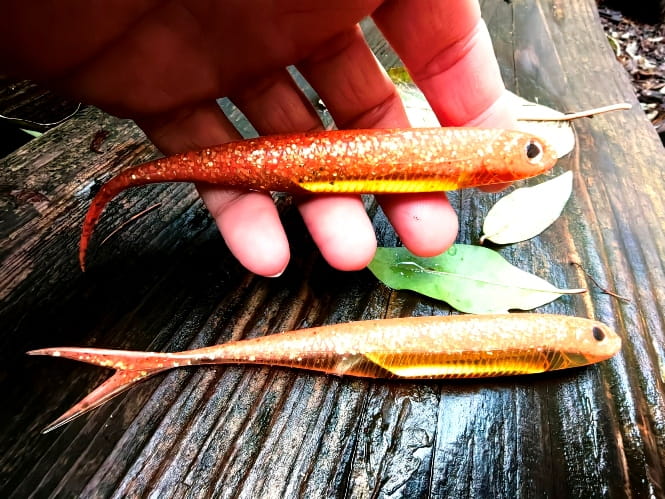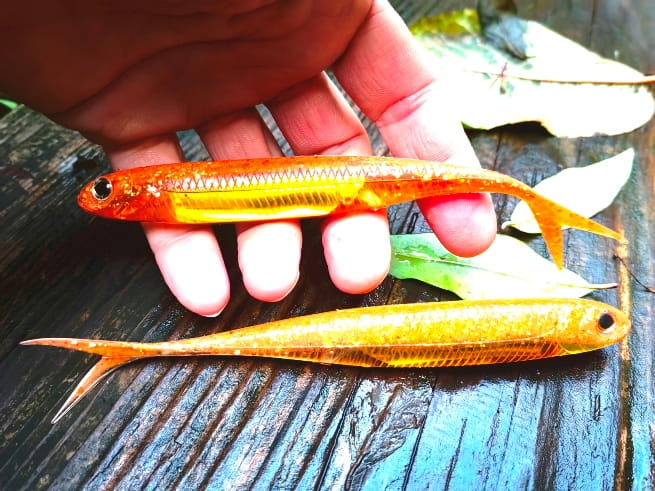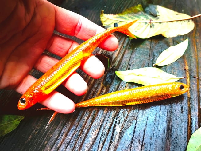Realistyczne odwzorowanie ryby. Rozwidlony ogonek pracuje nawet przy najmniejszym ruchu przynęty. Umieszczony w jej wnętrzu materiał imituje błysk uciekającej ofiary prowokując drapieżnika do ataku.
